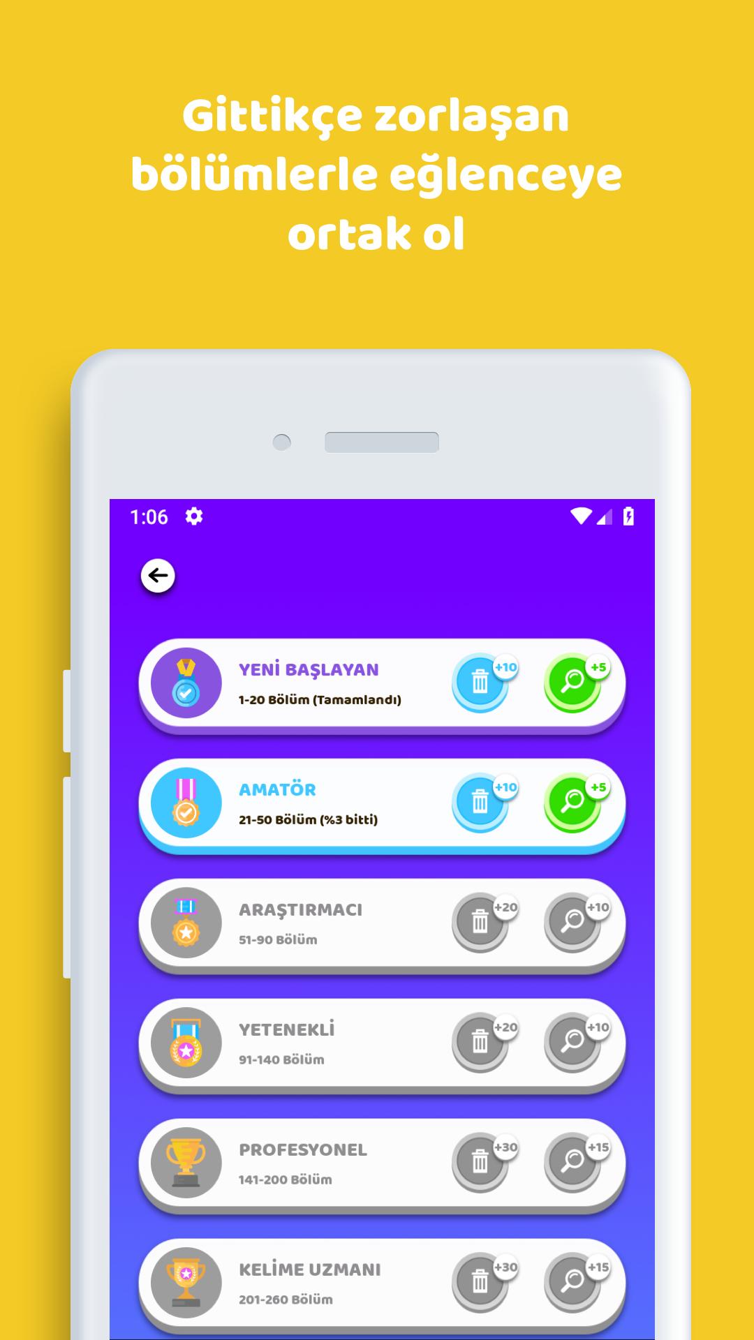 Le jeu Word Puzzle se compose de sections. Si vous terminez avec succès les chapitres, vous obtiendrez un nouveau titre. Chaque titre que vous gagnez vous rapportera des points et des indices.